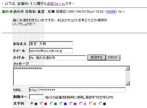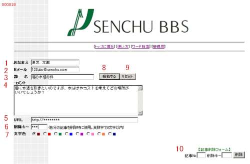 記入欄:記述例 @おなまえ:(例)岸和田市の小林 (実名でなくても結構です) AEメール:(例)123abc@senchu.co.jp(半角英数で) B題名:短いタイトルを入れてください。 Cコメント:お問合せや、ご質問などなんでも書き込んでください。 DURL:ホームページをお持ちの方はご記入ください。 E削除キー:半角英数字で8文字以内を記入しておけば後でご自分で内容を削除できます。 F文字色:掲示板に指定した色で表示されます。