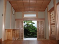玄 関 吉野 赤杉を使ったこまい天井。 床は、松の無垢板 正面の玄関建具はあえて透明のガラスを入れ玄関前の庭を借景としました。。 |