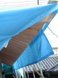 玄関の屋根 野地垂木、裏甲、広小舞の順、野地板の順に施工しています。 手間はかかりますが、ここにも日本建築の「美」が有ります。 贅沢にも木部の見えるところには、節が無いように配慮しています。 |
