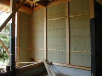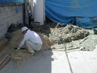 土練り 前もって藁を混ぜて腐らせておいた土に、現場にて再度藁を混ぜ適度な硬さに練ります。 木部取り合いのところには、蚊帳などを再利用し、土と一緒に塗りこめ割れ止めとします。 |
