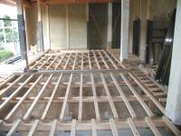 床根太 1尺間隔に根太を流してゆきます。 樹種は桧。 強度を考え芯持ち材を使用しています。 |