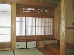 書院 (内観) 書院造りの基本を踏襲。 手前は床柱。天然杉 絞り丸太 |