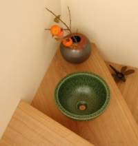 手洗い鉢 京都から手洗い鉢が届きました。 いつもひと工夫を心がけています。 今回はWCにこの焼き物を使わせていただきます。 いい色合いでしょう?! さてどんな風に出来上がるでしょうか? |