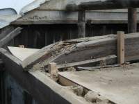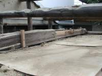 桁の下がり 本葺きの重さもあり桁が下がっていた。 瓦等を取り除くと幾分その曲がり元に戻った。 改修ではこの辺も改良の必要がある。 小屋組み全体に腐朽や虫食いが見られます。 |