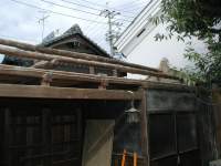 解体 (東南面) 瓦・野地を外したところ。 棟木・母屋の腐朽が見られる。 本建物は約10年前より「雨漏りが顕著かし数回修理を行ってきた。 |